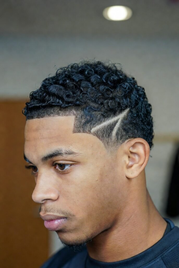 The design element adds an artistic flair that elevates the look beyond a standard curl fade.