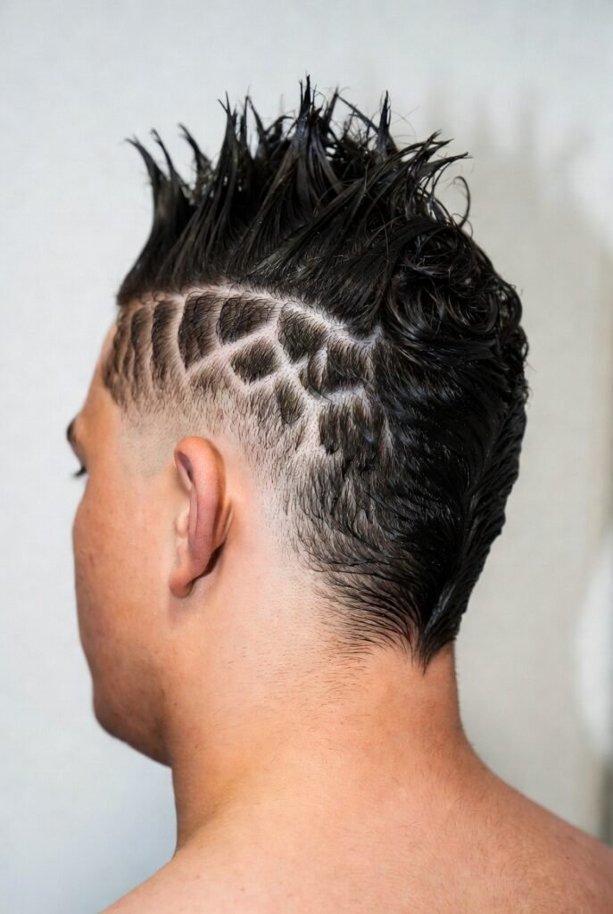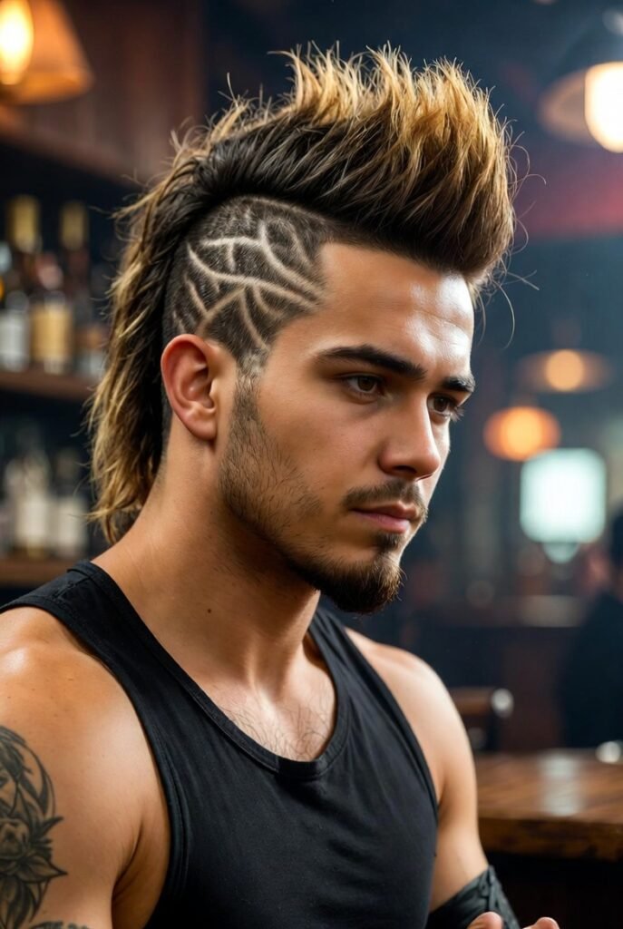 The sides feature intricate tribal-inspired patterns shaved into a gradient fade. It’s theatrical, it’s bold, and it absolutely commands attention.