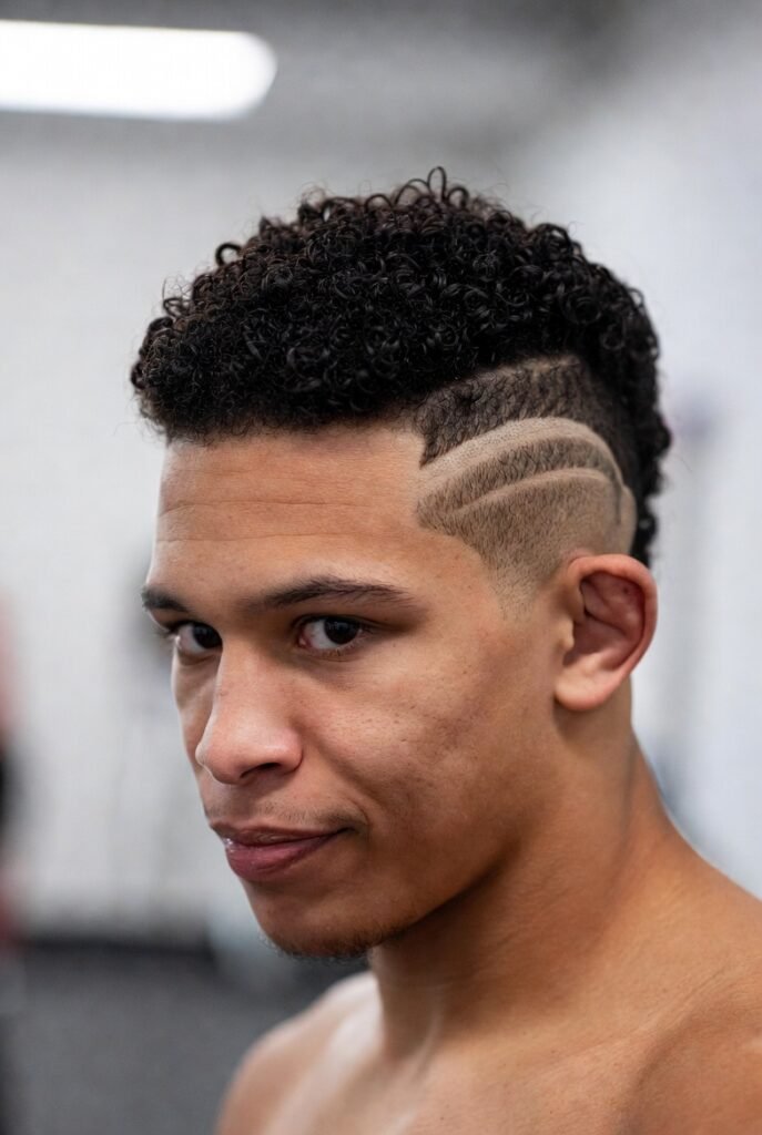 The top and back maintain generous length with natural curl patterns, while one side features a tight fade with parallel line details.